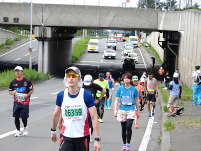 みなさん歩いてます。「この先35km地点が関門になりますが・・このままでは無理です」